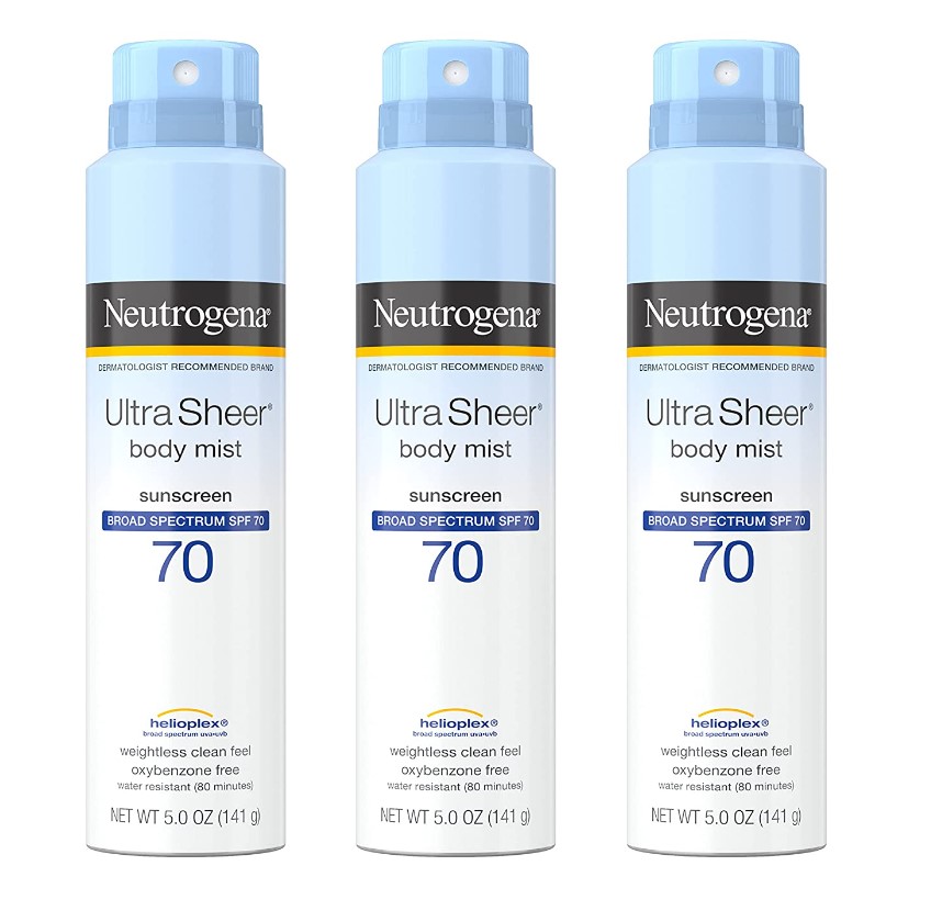 Neutrogena Ultra Sheer Body Mist Sunscreen Spray Broad Spectrum SPF 70, Lightweight, Non-Greasy & Water Resistant, Oil-Free & Non-Comedogenic UVA/UVB Sunscreen Mist, 5 oz