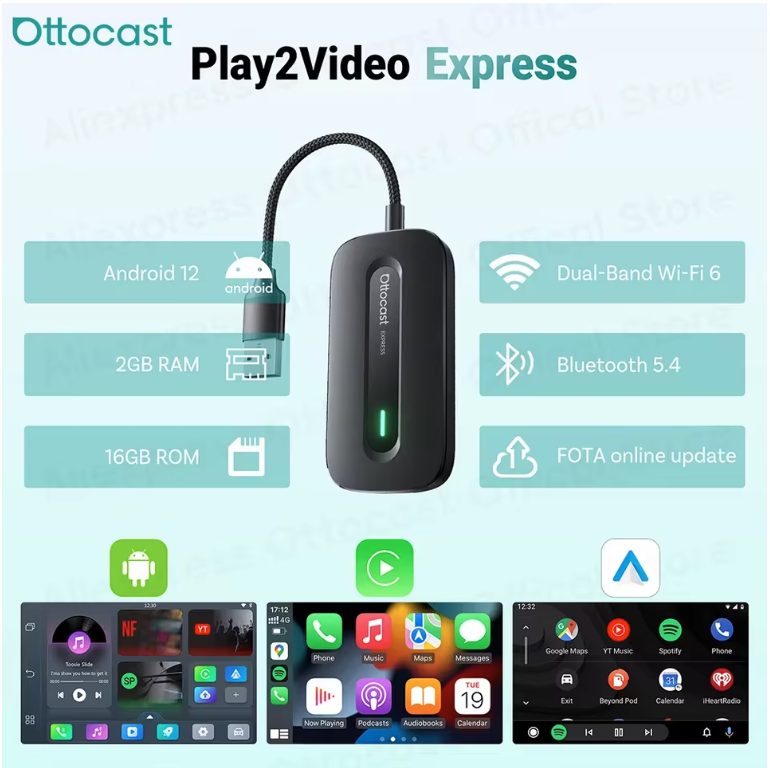 OTTOCAST Play2Video Express Wireless CarPlay Wireless Android Auto Adapter for Youtube Netflix Video Playback Car Accessories