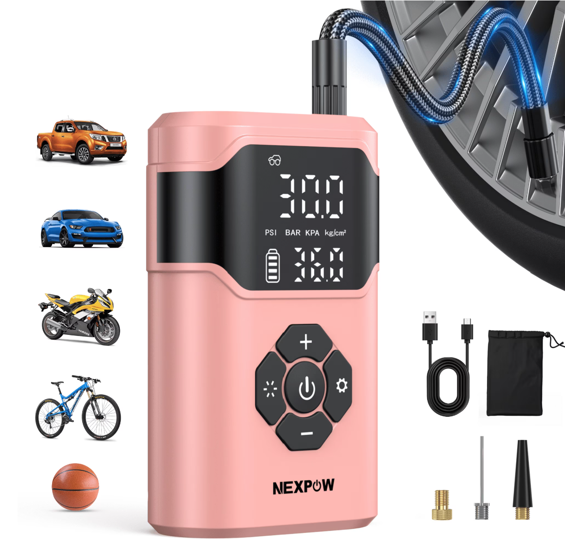 NEXPOW Tire Inflator Portable Air Compressor, 150 PSI Air Compressor for Car Tires with Dual-Screen Display, 3X Fast Inflation Portable Bike Pump for Car, Motorcycle, Bike, Ball, Pink