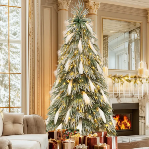 6 FT Snowy Christmas Tree with Feathers and Lights